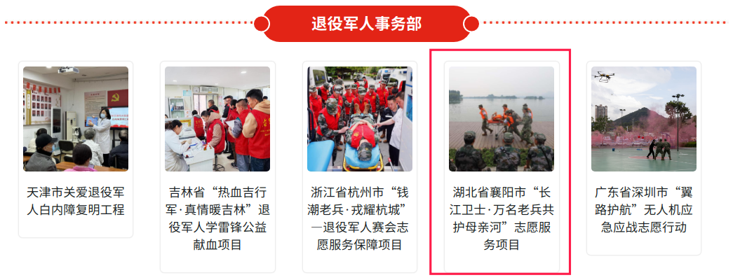 湖北省襄阳市退役军人“长江卫士”志愿服务队于2021年3月起连续三届开展“长江卫士·万名老兵共护母亲河”志愿服务项目,成立12支志愿服务队2730支分队,吸纳2万余名老兵志愿者,在长江的最大支流——汉江襄阳流域筑起“绿色”哨位,开展安全巡逻、防汛救灾、禁渔禁采、防水防溺、保护环境等9个项目活动2000余次,被生态环境部长江流域生态环境监管局授予“万名老兵共护汉江河·志愿服务队(湖北·襄阳)荣誉旗帜”,“长江卫士·万名老兵共护母亲河”志愿服务项目获湖北新时代文明实践志愿服务项目大赛铜奖,5支分队入选全国“戎耀家园·暖心邻里”退役军人守护家园志愿服务项目,开展各类志愿服务活动被人民日报、荆楚网、退役军人事务部门户网站等报道30余次。