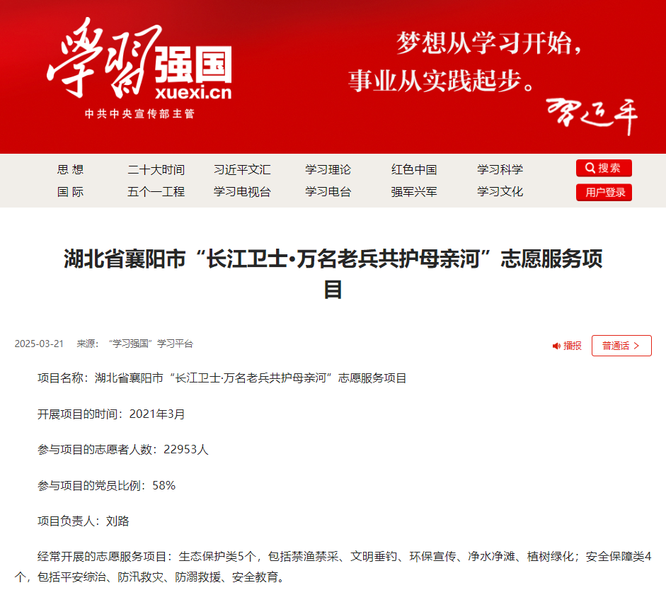 湖北省襄阳市“长江卫士·万名老兵共护母亲河”志愿服务项目